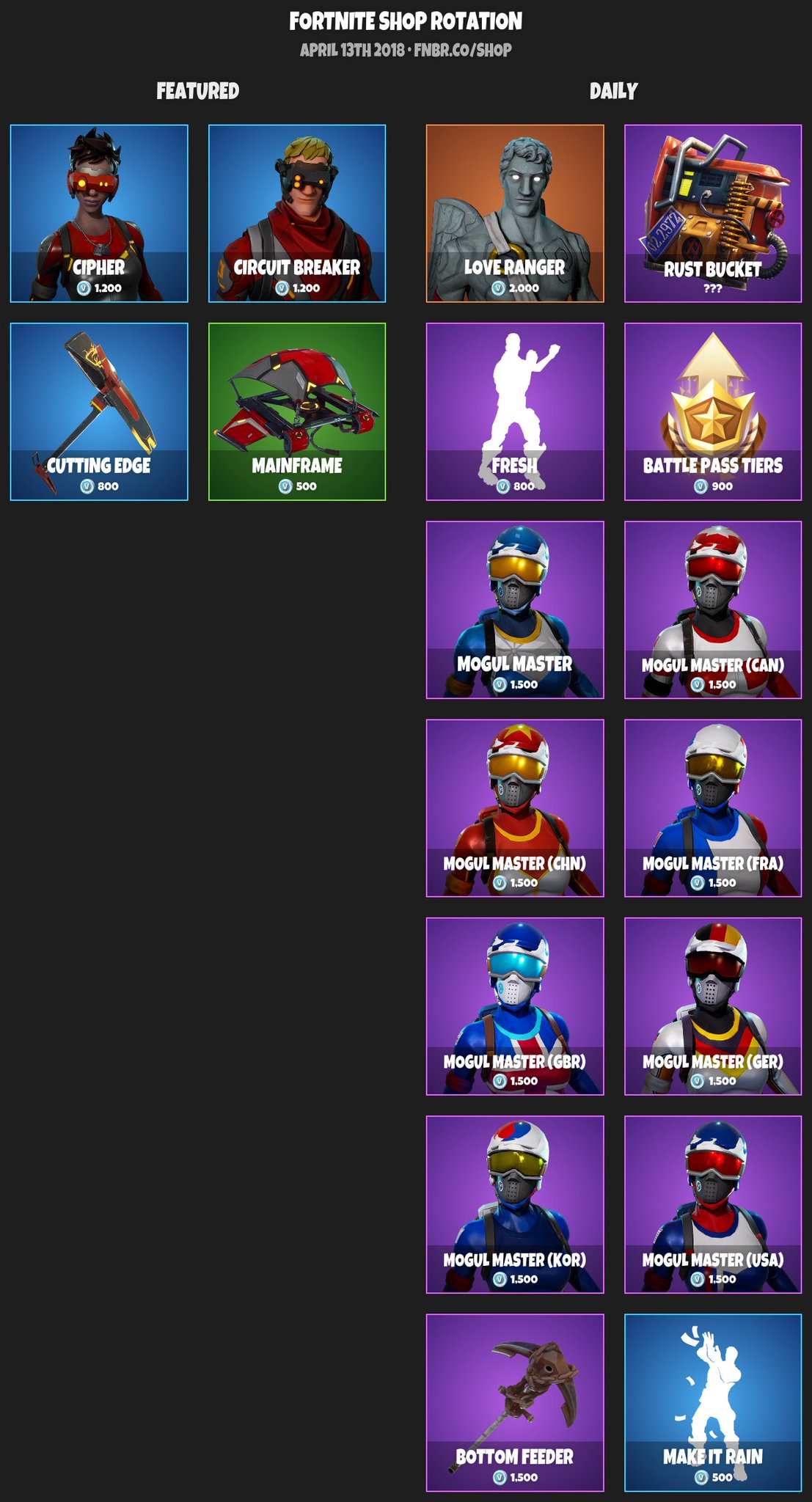 (if it's open) game credits: Current items all shop items shop history battle pass season 1 season 2 season 3 season 4 season 5 season 6 season 7 season 8 season 9 season 10 c2 season 1 c2 season 2 c2 season 3 c2s4 nexus war (marvel) c2s5 zero point c2s6 primal c2s7 invasion Check out ttd sync, +group emotes. If you have a suggestion put it on the group wall. Share your opinion on this shop by voting on it at the bottom of this page. Fnbr.co fortnite bot to view the current item shop and automatically post it at reset (00:00 utc) You can see yesterday's item shop here. Imported animations and models from fnbr. Here are the last 18 days of item shop rotations for fortnite battle royale. New update might have bugs, please spare me shutdown = update/bug fixes welcome to ttd! Click one to view full shop or scroll to view full item shop history by day. We don't tolerate exploiting, stealing or bullying. How to add a fortnite item shop bot to your discord server.!